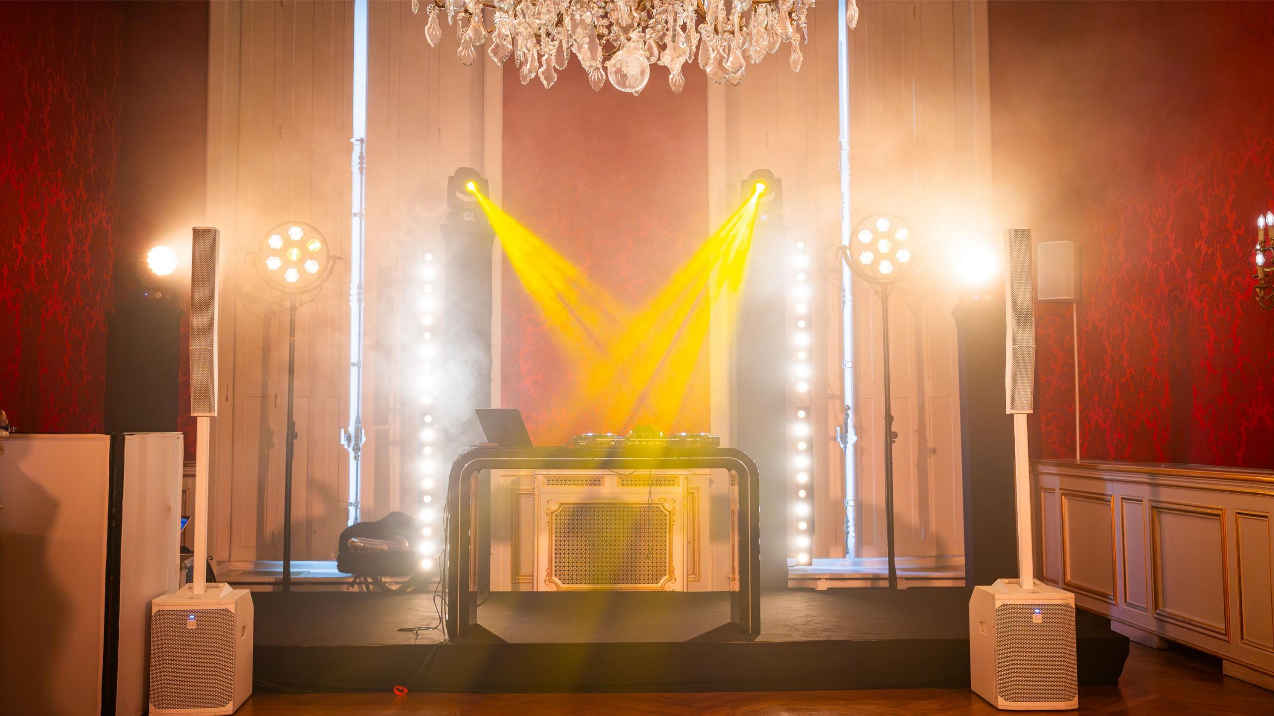 Location éclairage DJ clé en main : pack comprenant totems aluminium, lyres robotisées, effets lumineux, machine à brouillard et technicien lumière pour une ambiance dynamique et festive.